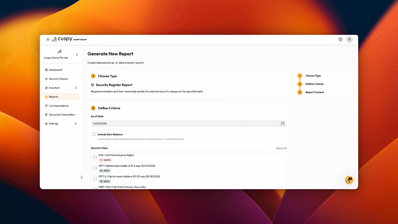 Asset issuers can now filter out zero-balance holders from the security register report. By default, only investors with a positive balance in the selected security classes are shown.